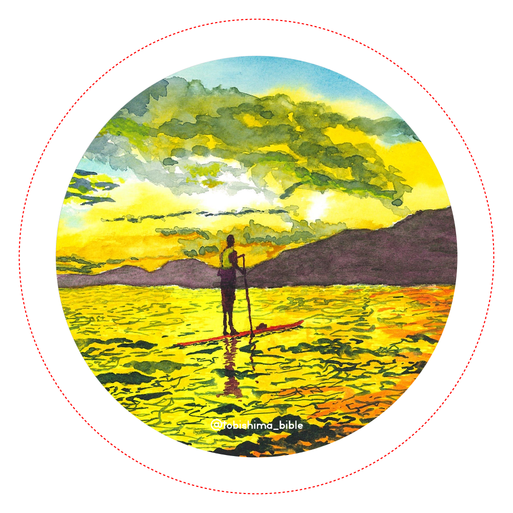 とびしま海道上蒲刈島の恋ヶ浜の夕日とSUPです。 令和3年度広島県Web公募美術展入選作品をプリントしました。